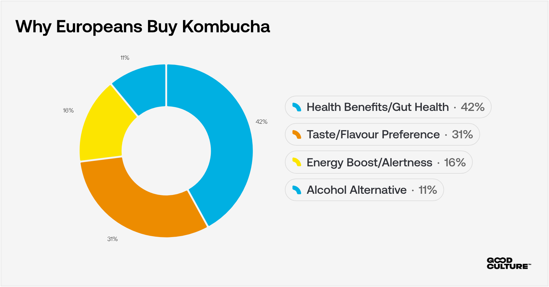 But taste is rising fast at 31%. As the category matures and discovery shifts from health food stores to mainstream cafés, European consumers are becoming more like their North American counterparts. They're choosing kombucha because it tastes good and happens to offer health benefits, not the other way around.